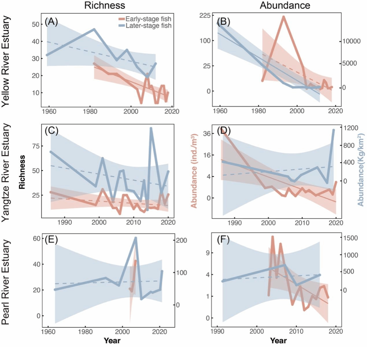 研究成果表明:(1)过去半个世纪以来,中国三大典型河口——长江口、黄河口和珠江口的鱼类丰度(数量)持续下降,而物种丰富度(种类数)除黄河口外基本保持稳定;(2)多尺度威胁因素对不同生活史阶段鱼类影响显著:捕捞强度与成鱼丰度显著负相关,是驱动成鱼数量下降的主因;鱼卵和仔稚鱼丰度则与上游淡水输入负相关、与泥沙输入量正相关,表明水沙失衡已成为限制早期生活史阶段补充的关键因素;(3)全球变暖导致海表温度上升,促进暖水种迁入,使部分河口(如珠江口)出现物种多样性增加的现象,但总体生物量下降趋势未被逆转。研究指出,当前禁渔政策可有效缓解过度捕捞压力,但需进一步关注上游水沙调控的生态阈值与气候变暖的潜在影响。研究建议,应将禁渔政策与水沙精细化调度及气候适应性管理相结合:在工程管理层面,优化调水调沙时序与强度,使其与鱼类繁殖及早期育幼需求相匹配;在生态管理层面,加强育幼场保护,提升河口系统整体韧性与自我修复能力。